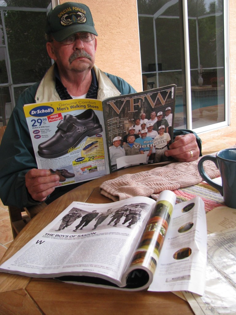 Chuck Walsh, a former Green Beret staff sergeant in Vietnam, who now lives in Bellagio subdivision in Venice, Fla., served in the 5th Special Forces unit in 1962 looks at a VFW magazine with his picture on the cover. The cover story is about a dozen old soldiers returning to the country as a group in 2005. Photo by Don Moore