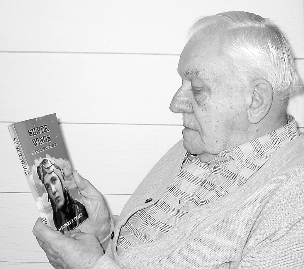 Robert Grace looks a copy of “Silver Wings,” an autobiography he wrote about his misadventures during the Second World War. Sun photo by Don Moore