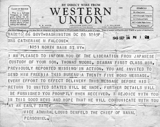 Some 3 ½ years after his submarine was reported missing in the Java Sea, Tom Moore’s mother received this telegram from the U.S. Navy, six weeks after the end of the World War II. Until she got the telegram from the government she thought her son was dead.