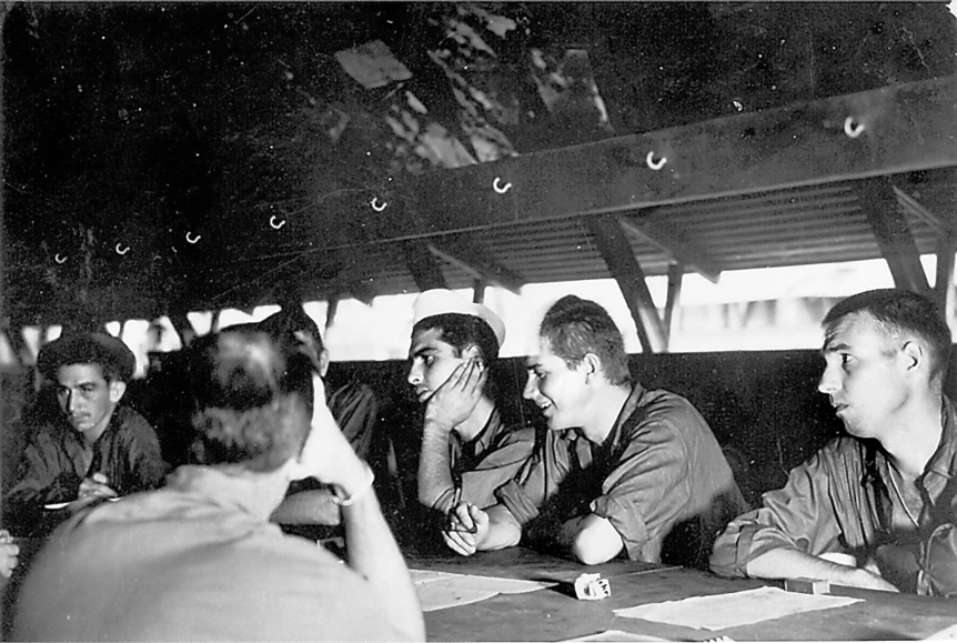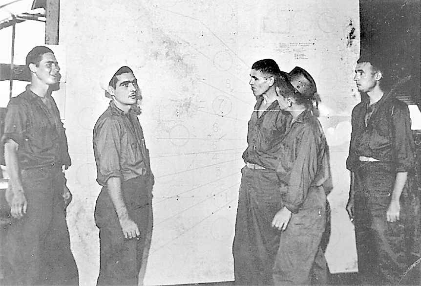 Members of the USS Perch are being debriefed by the U.S. Navy shortly after their release from the POW camp on Palawan Island in the Pacific. From the left: Joe Sisk, Moore, Wolf Spirandino and Tom Singleton.