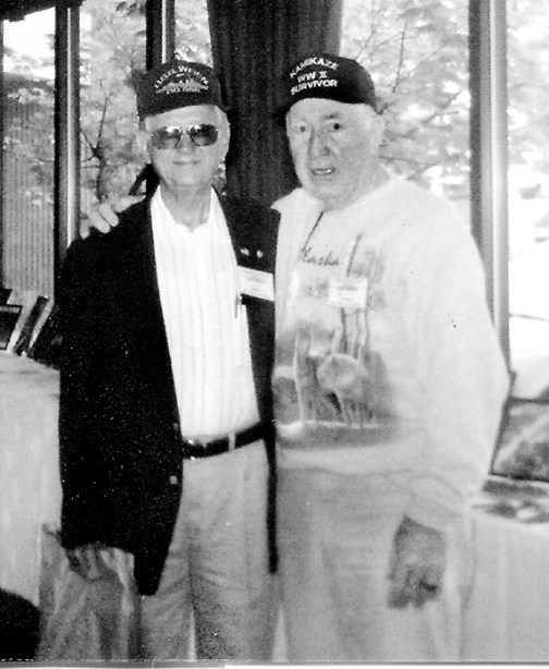 It took Al Trombi (right) more than half a century to learn what happened to the Japanese Betty bomber headed his way. With him is L.J. Adams of Pasadena, Tex. who shot down the kamikaze with his 20-mm anti-aircraft gun. Photo provided