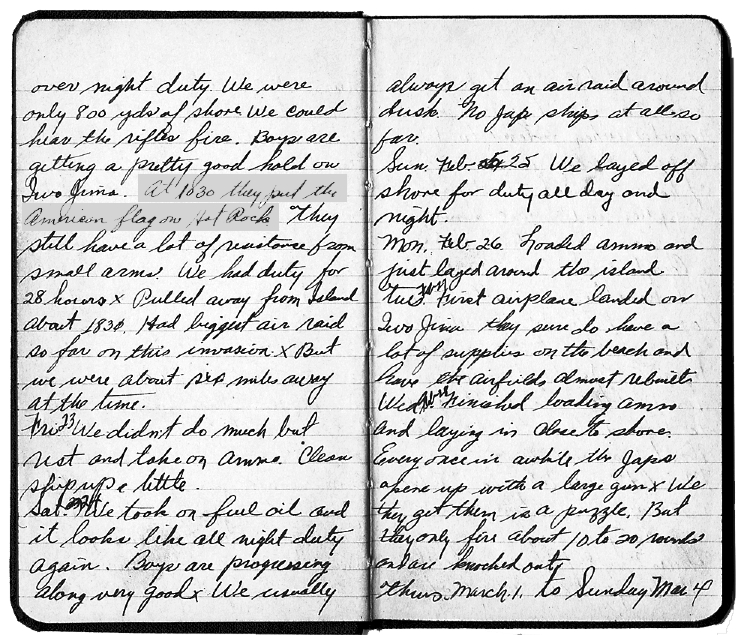 “At 10:30 a.m. they put up the American flag on ‘Hot Rocks’ (Suribachi),” he noted. “They still have lot of resistance from small arms.”