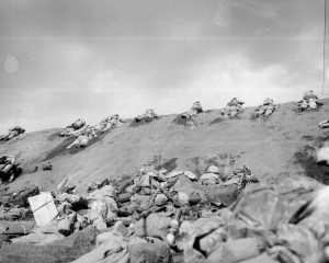 The first flag goes up on Iwo. This flag-raising most people don’t know anything about. The famous picture of the 2nd flag-raising captured by  AP photographer Joe Rosenthal that made the front page of hundreds of newspapers in the US amounted to nothing, according to the men who put it up. Photo by Sgt. Lou Lowery/Leatherneck Magazine