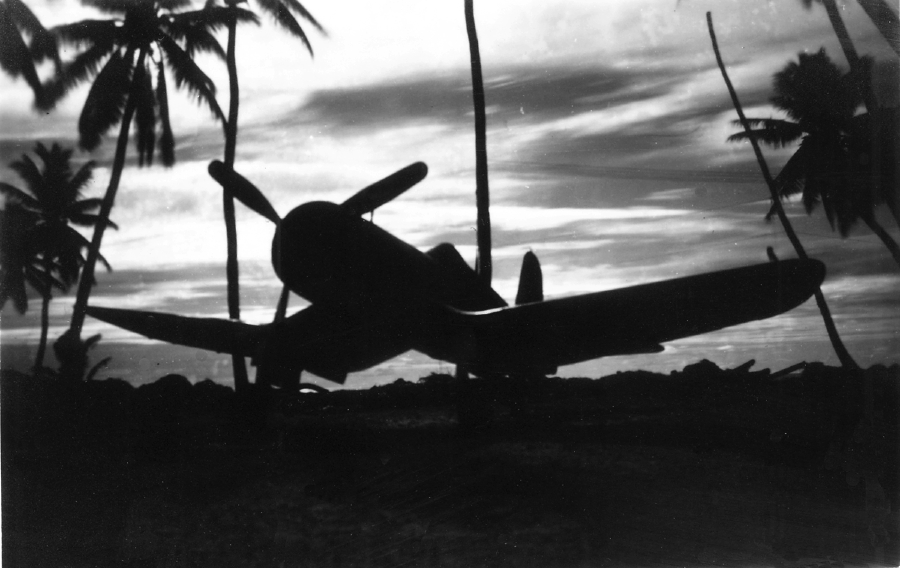 The outline of a U.S. Marine Corps gull-wing Corsair fighter is silhouetted against the setting sun at Kwajalein Island in the Pacific during World War II. 2nd Lt. Magill took the picture of his plane and used it on Christmas cards he sent friends from the front in 1944. Photo provided by Bill Magill