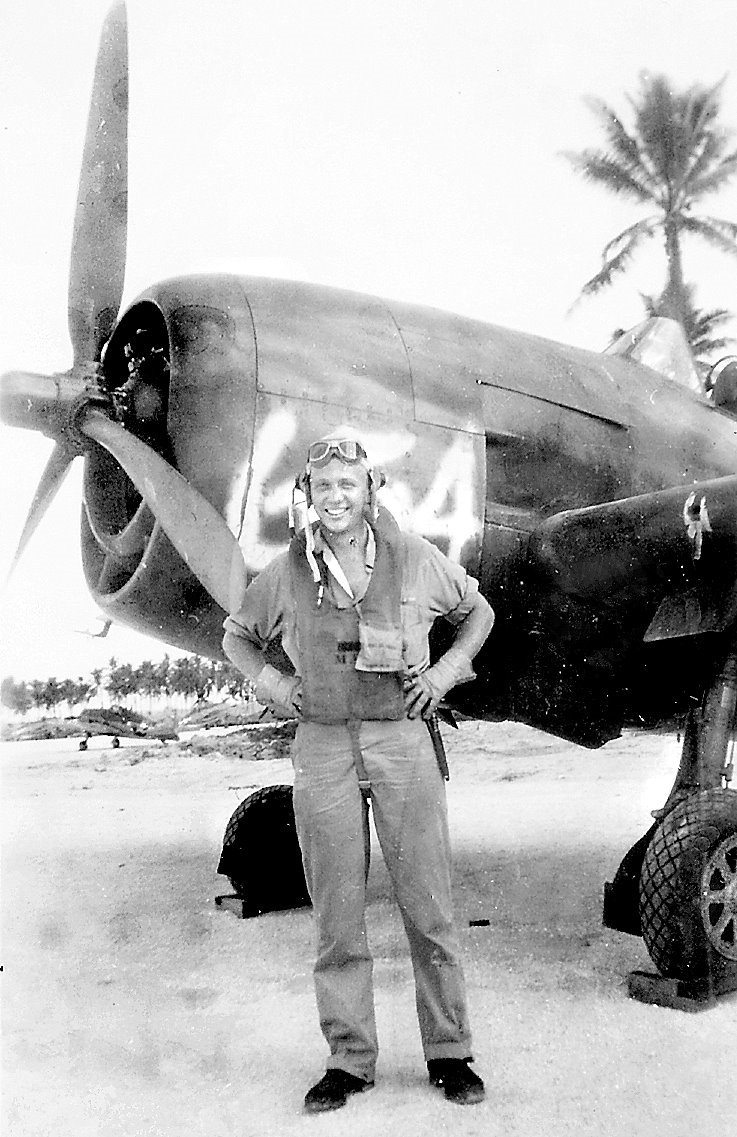 Ensign Woody Lindskog stands in front of his Grumman Hellcat fighter plane. He was a member of Navy Air Group 60 that was part of Adm. T.C. Kinkaid’s 7th Fleet. Photo provided