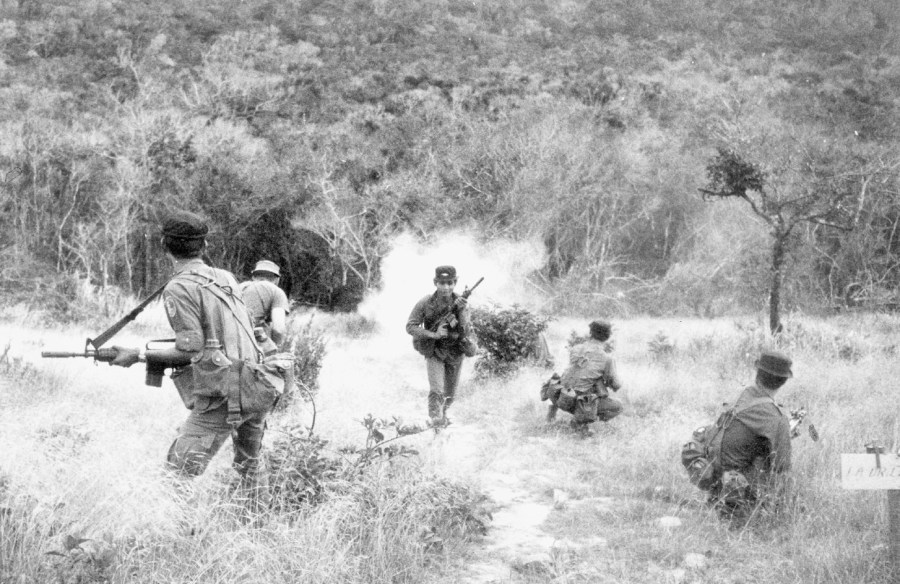 Members of a six-man recon team practice an “Action Drill” in Vietnam. This was a drill so all members of the team knew what to do if they were ambushed by the enemy. The first thing they did was get out of the area with all of its members as quickly as possible. Photo provided