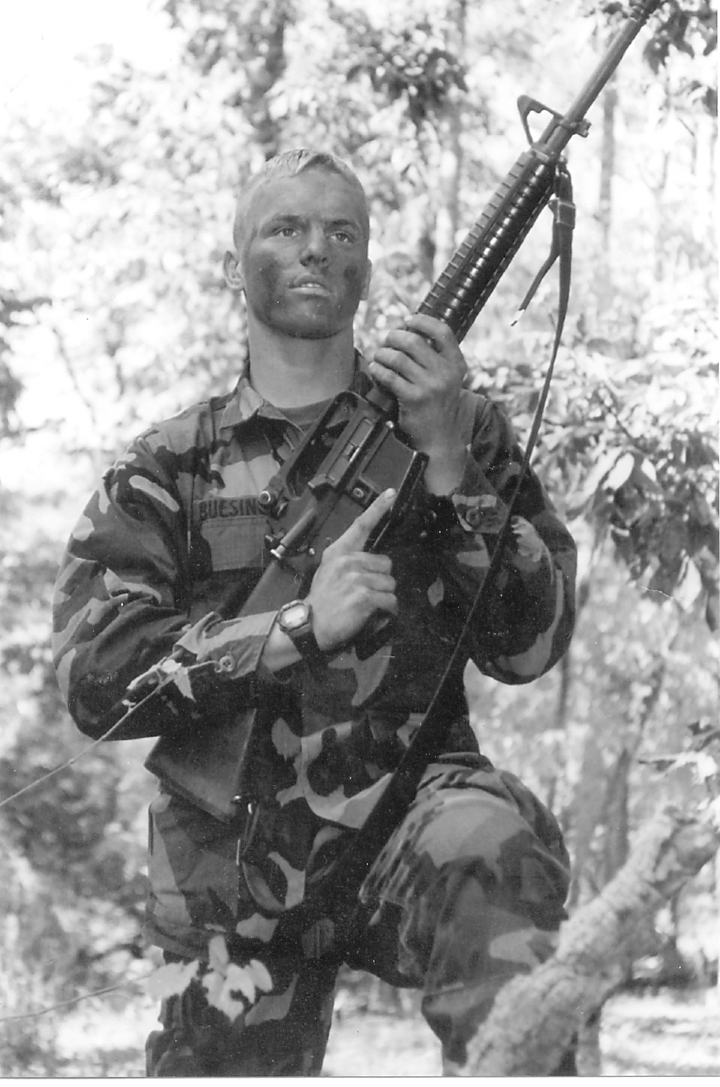 Brian holds his M-16 rifle at the ready as he looks prepared in his camouflage fatigues and painted face during training at Camp Le Jeune, N.C. in September 2002. Photo provided by William Buesing Jr.
