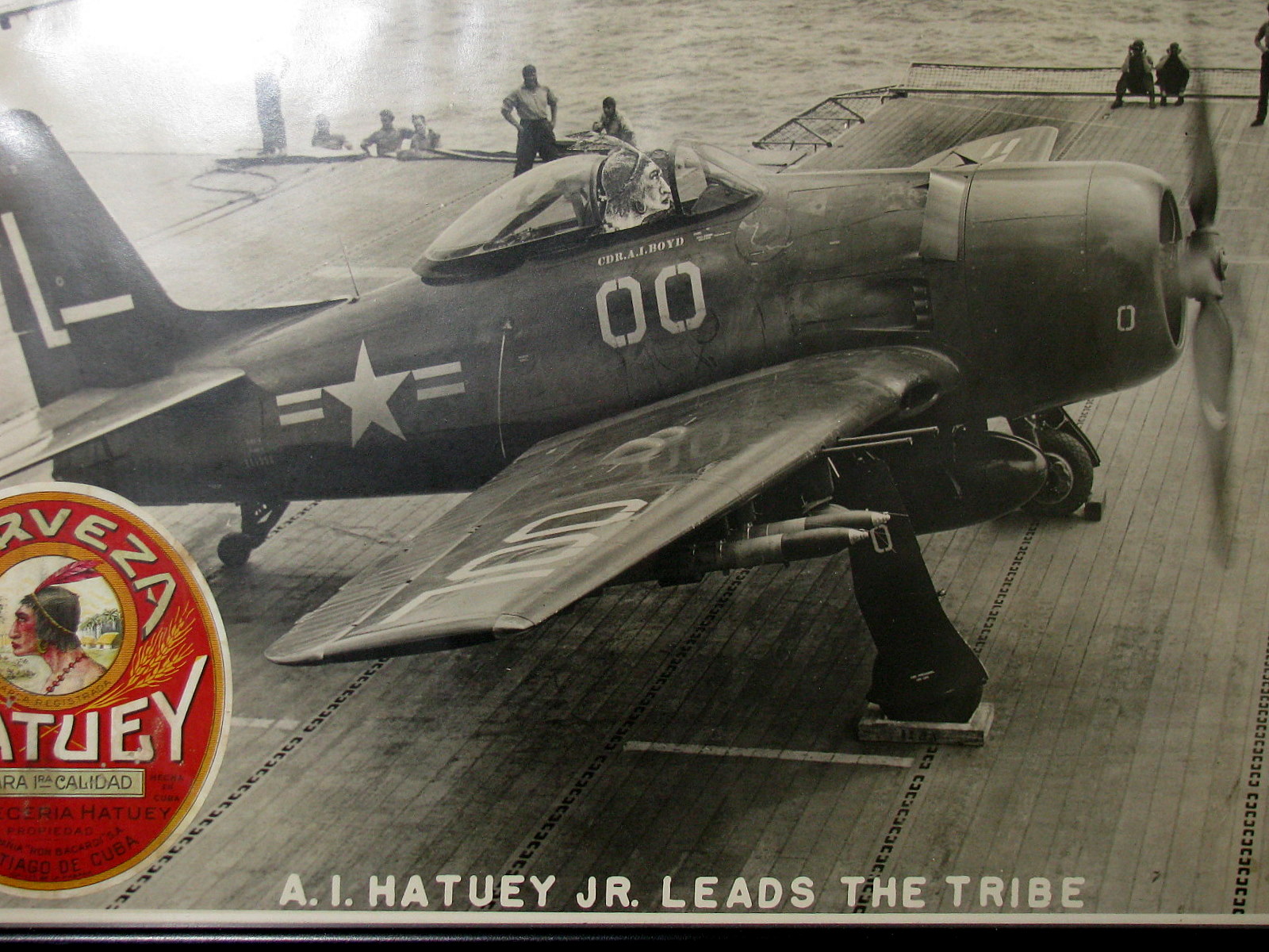 There is also a large picture of an F-6-F “Hellcat”on the deck of an unnamed carrier, presumably during World War II. On the side of the plane in yellow is stenciled: “Cmdr. A. L. Boyd.”