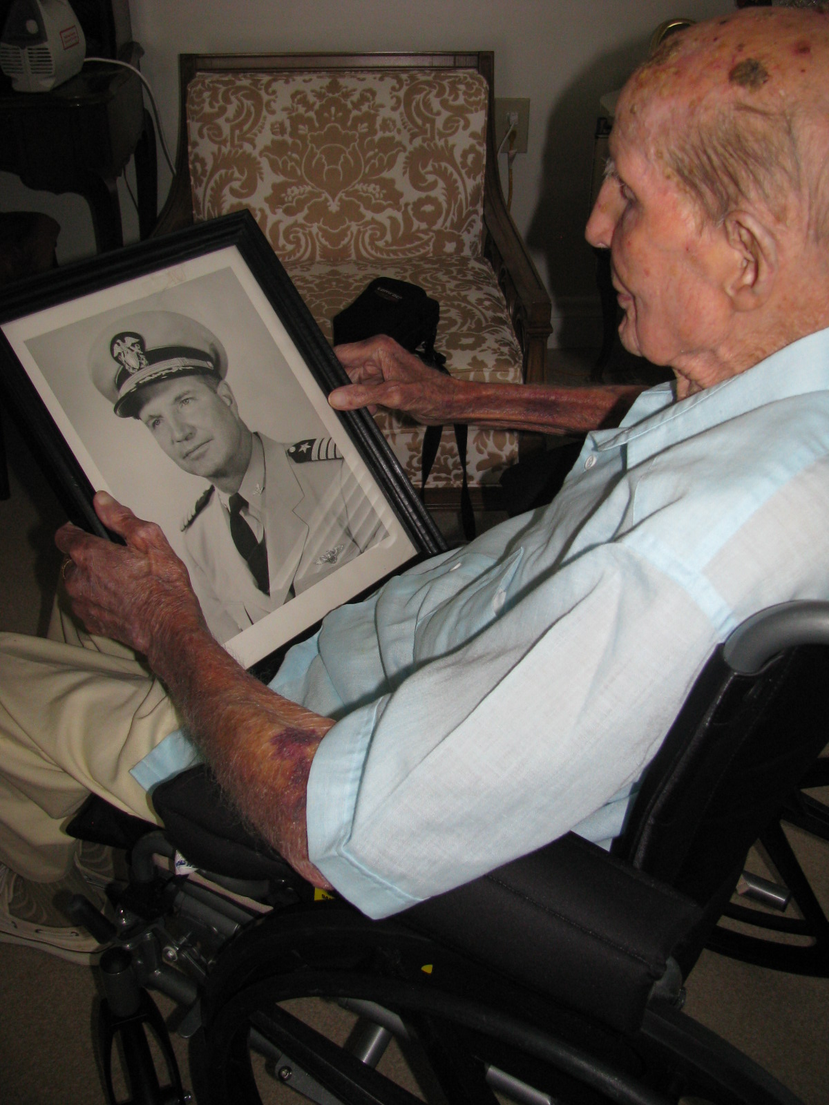 Al Boyd, who lives at Sterling House in Punta Gorda, looks at a picture of himself when he retired as Navy captain in 1965. He fought in World War II and Korea as a naval aviator. He celebrates his 100th birthday on Friday. Sun photo by Don Moore