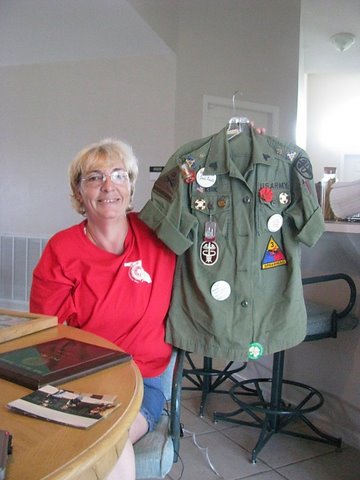 Former Army Sgt. Ruth Russell of Punta Gorda holds a shirt she wears to conventions adorned with military patches and other paraphernalia from her past service connections. Sun photo by Don Moore