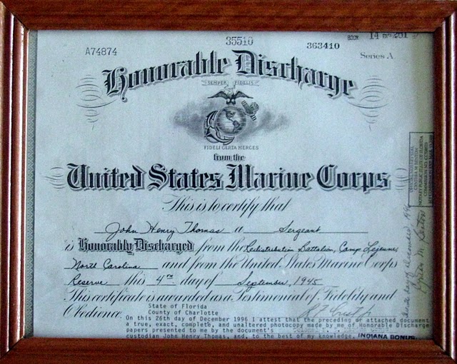 John Henry Thomas was a Marine who served in the Pacific during World War II, but never fired a shot in battle. He was a carpenter before the war who worked in the woodworking shop at the Marine Corps barracks in Pearl Harbor almost a year after the Japanese bombed the Pacific Fleet at Pearl dragging the United States into war.