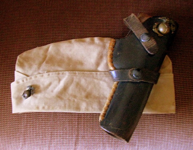 This is Thomas’ Marine Corps cap and the holster for a .45 caliber pistol he wore while serving as a sergeant in the Pacific during World War II. Sun Photo by Don Moore