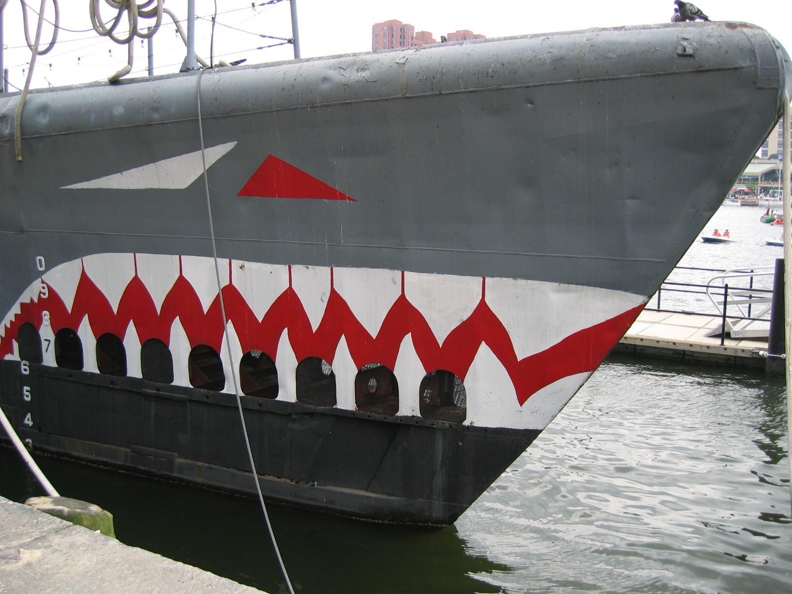 The USS Torsk is painted for battle with tiger shark’s teeth on the bow. The Tench Class submarine made its 2nd combat cruise into the Sea of Japan. Photo courtesy of Kevin H.