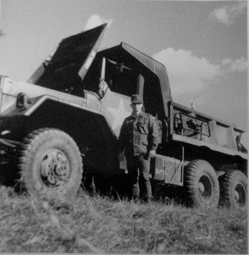 Spec-5 Jim Broom and his five-ton dump truck is pictured some where in Vietnam. He was a member of the 815th Engineering Battalion over there and spent 11 months driving this truck throughout the Central Highlands combat zone. Photo provided