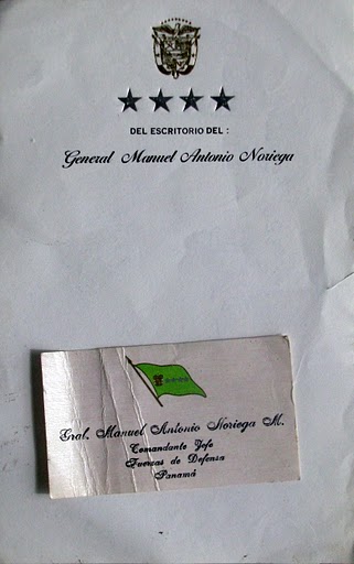 He kept a piece of personal note paper he found in Gen. Manuel Noriega’s office in Panama City. The dictator’s business card is pasted to the bottom of the note paper. Sun photo by Don Moore
