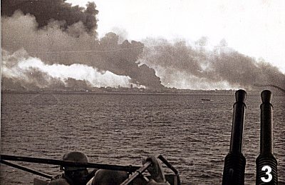 Ships burn off Port Said during the 1956 Suez Canal crisis in which Royal Marine Sergeant Ken Armstrong was involved. Photo provided