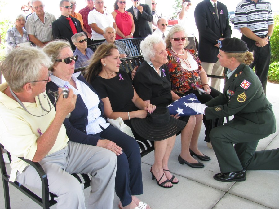 For grateful service: An Army sergeant presents Betty Turner with her husband, Hudson Turner’s, burial flag during a service held Monday afternoon at the Sarasota, Fla. Veterans National Cemetery. At Betty’s far left is her son, Philip and her daughters: Carolyn and Elizabeth. Sun photo by Don Moore