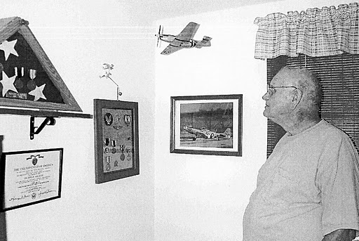 Miller is pictured in his Englewood home at 80, nine years ago when his story first ran in the Sun, looking at some of his flying memorabilia from World War II. Sun photo by Don Moore