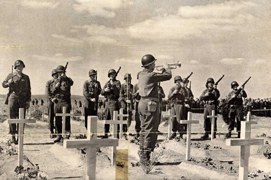 A bugler from the 102nd Infantry Division plays taps as a rifle squadron fires a volley to commemorate 1,016 concentration camp prisoners murdered by German SS Troops at Gardelegen, Germany. Photo provided