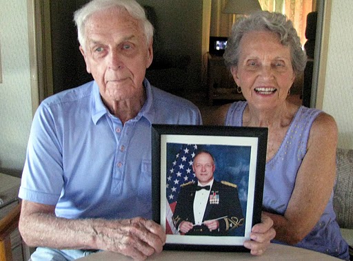 Col. Thomas Palmatier is conductor of the U. S. Army Band headquartered at Fort Myer, near Washington, D.C. Here his father and mother, Harold and Marjorie Palmatier who live in Harbor Cove in North Port, FLA. hold his picture. Sun photo by Don Moore