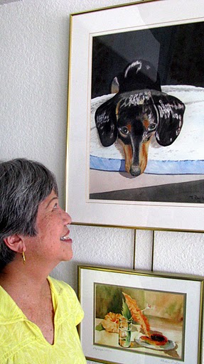 Daida looks at a watercolor of her dog “Dieter” she painted that’s on the wall of her dining room. Sun photo by Don Moore