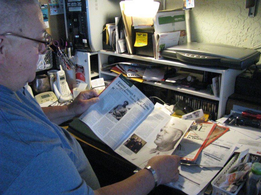 Jim Mazy looks at a Dec. 2006 edition of “Leatherneck Magazine,” the official Marine Corps publication. It contains a story about Col. Joseph “Bull” Fisher, Mazy’s regimental commander in Vietnam. Included in the story are pictures of the colonel as well as Pvt. Mazy. Sun photo by Don Moore