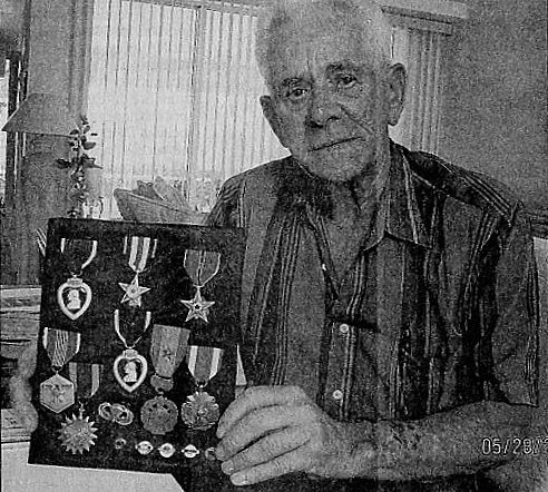 Walter Levasseur of Rotonda holds a board containing his Army military decorations. Included are two Purple Hearts, a Silver Star, two Bronze Stars and an Air Medal. Sun photo by Don Moore