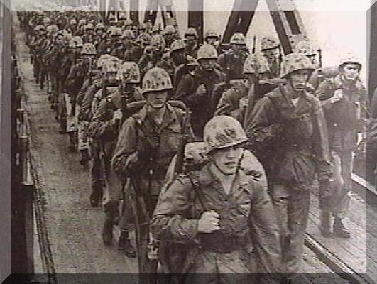 American Marines cross “Freedom Bridge” linking North and South Korea at Panmunjom during the closing days of the Korean War. Photo provided