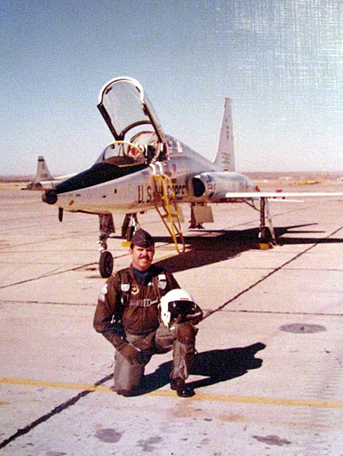 2nd Lt. Sam Harris of Punta Gorda Isles, Fla. squats in front of his T-38 “Talon” supersonic, two-seat jet at Lakeland Air Force Base in April 1972 during Air Force training. Photo provided