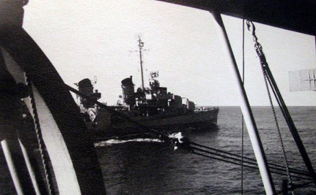 “Shortly thereafter we joined the fleet. We were no more in position when we were surrounded by Jap planes that kept coming at us from all directions. The destroyer beside us was hit by a Kamikaze amidship and burst into flames,” he said.