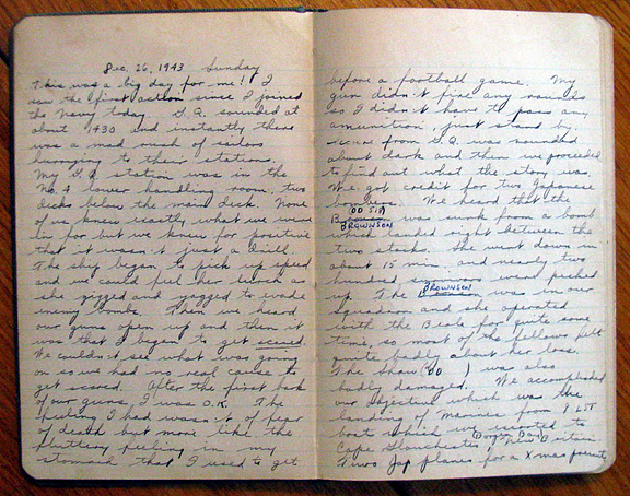 His diary picks up his story from there: “Dec. 23, 1943: Big Day, fleet went into action for the first time. We heard our guns open up and I began to get scared. After the first bark of our guns I was okay.