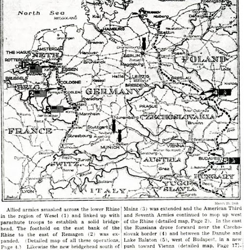 “Tonight thousands of Allied paratroopers, using hundreds of tons of equipment and supplies brought in by gliders, are fighting bitterly on the far bank of the Rhine in the area of battered Wesel, Germany to link up with British and American assault troops who crossed the river in boats earlier,” wrote Frederick Graham in a New York Times story published in the Newark, N .J., Sunday Call newspaper.