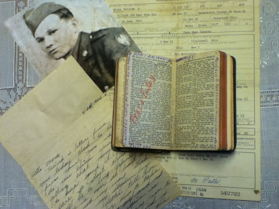 This collage of Pfc Waits WWII memorabilia includes a picture of himself, a letter he wrote home to his mother while in a POW camp, the Bible with its daily notations in it and his Honorable Discharge. Sun photo by Mary Auenson