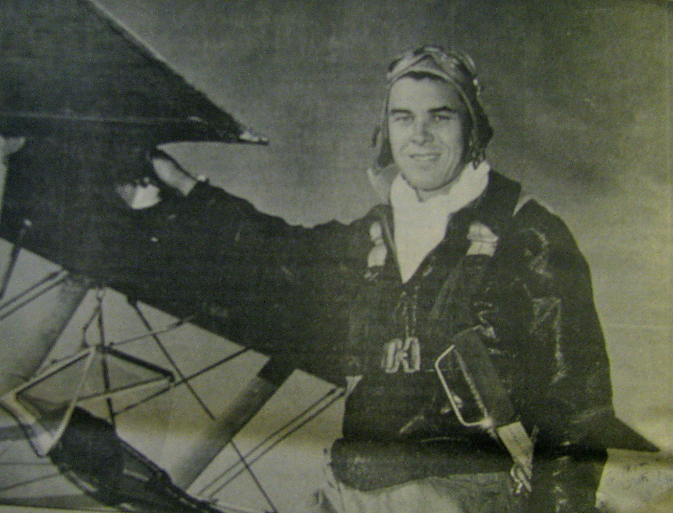 Flight Officer Bill Springer is pictured in his leather flying jacket and helmet standing on the wing of his Stearman advanced trainer. Photo provided