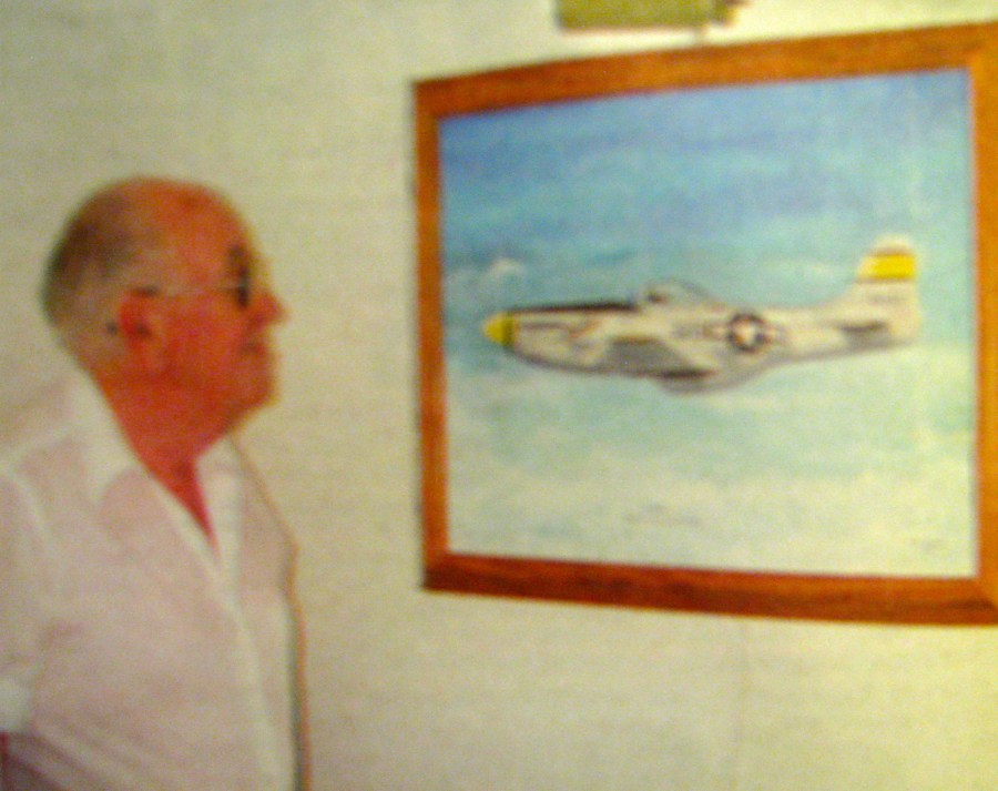 Bill Springer of Gulf Cove looks at an artist’s rendition of the P-51 Mustang he flew during the closing months of World War II. The local man flew bomber support and fighter sweeps over Japan. Sun photo by Don Moore