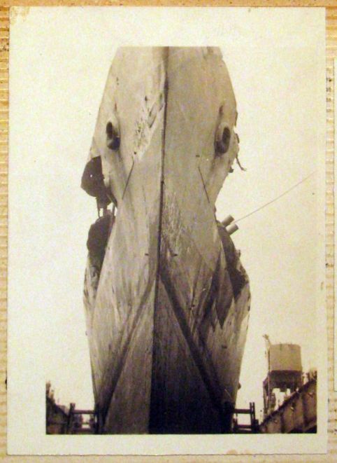 This badly damaged bow of the USS Rodman is pictured on the ways after being hit by Japanese Kamikaze fighter planes during the Battle of Okinawa. Photo provided