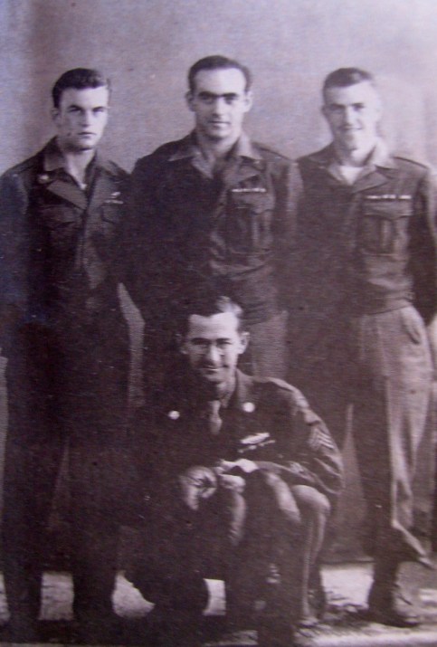 At the close of the war, while William Nickell was waiting to be shipped home, he became the 83rd Infantry Division’s middleweight boxing champ. He is shown standing at the far right. The other two fighters with him are Allan Hope and Abe Hoffman, (left to right). Squatting is Claude Clark, their trainer. Photo provided