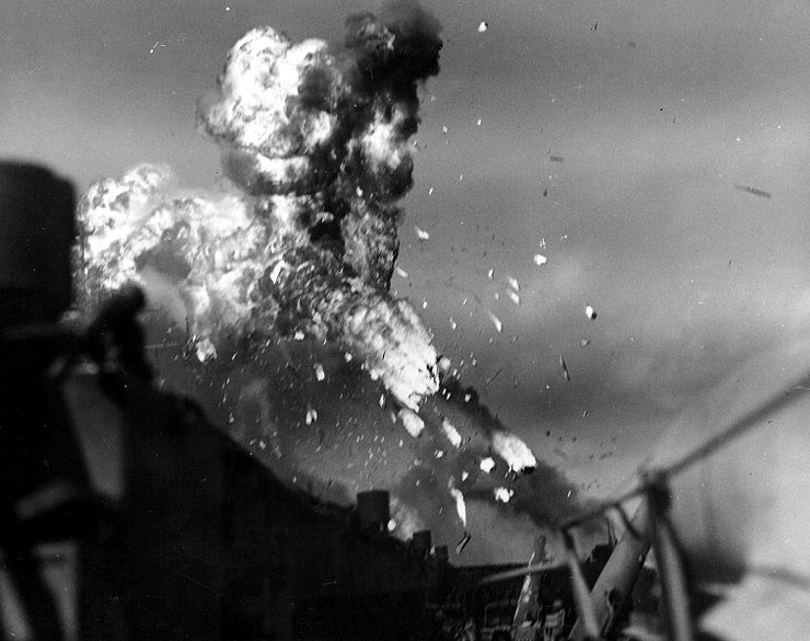 Five kamikazes hit the aircraft carrier USS Intrepid during the Battle of Leyte Gulf on November 25, 1944. The fireball from one of these attacking suicide planes can be clearly seen in this historical picture. Fred Sauer was aboard the “flat-top”. Photo provided