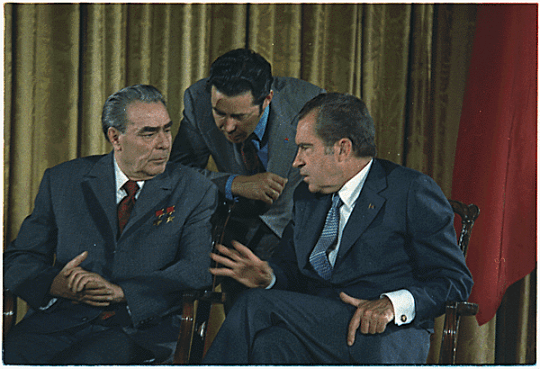 President Nixon, left, talks to President Leonid Brezhnev of Russia during a trip there. Photo provided