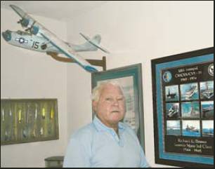 Dick Brown was in charge of two 40-millimeter antiaircraft guns on the port side of the aircraft carrier USS Intrepid during World War II. The framed pictures are of the Intrepid. He also flew as part of a PBY “flying boat” crew, like the one above his head, late in the war. Sun photo by Don Moore