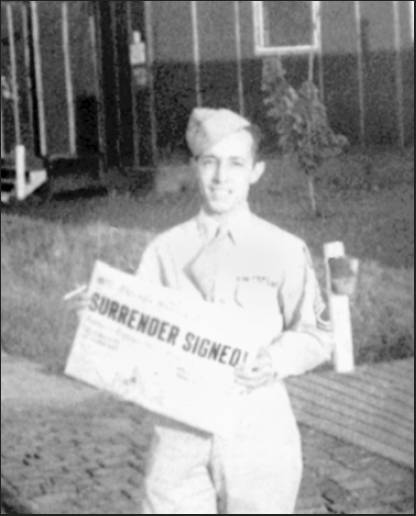 Vincent Durand of Port Charlotte, Fla. holds a copy of the local newspaper that says it all: “SURRENDER SIGNED!” This picture was taken at an air base near Madison, Wis., after he returned from his tour with the 8th Air Force in England during World War II. Photo provided