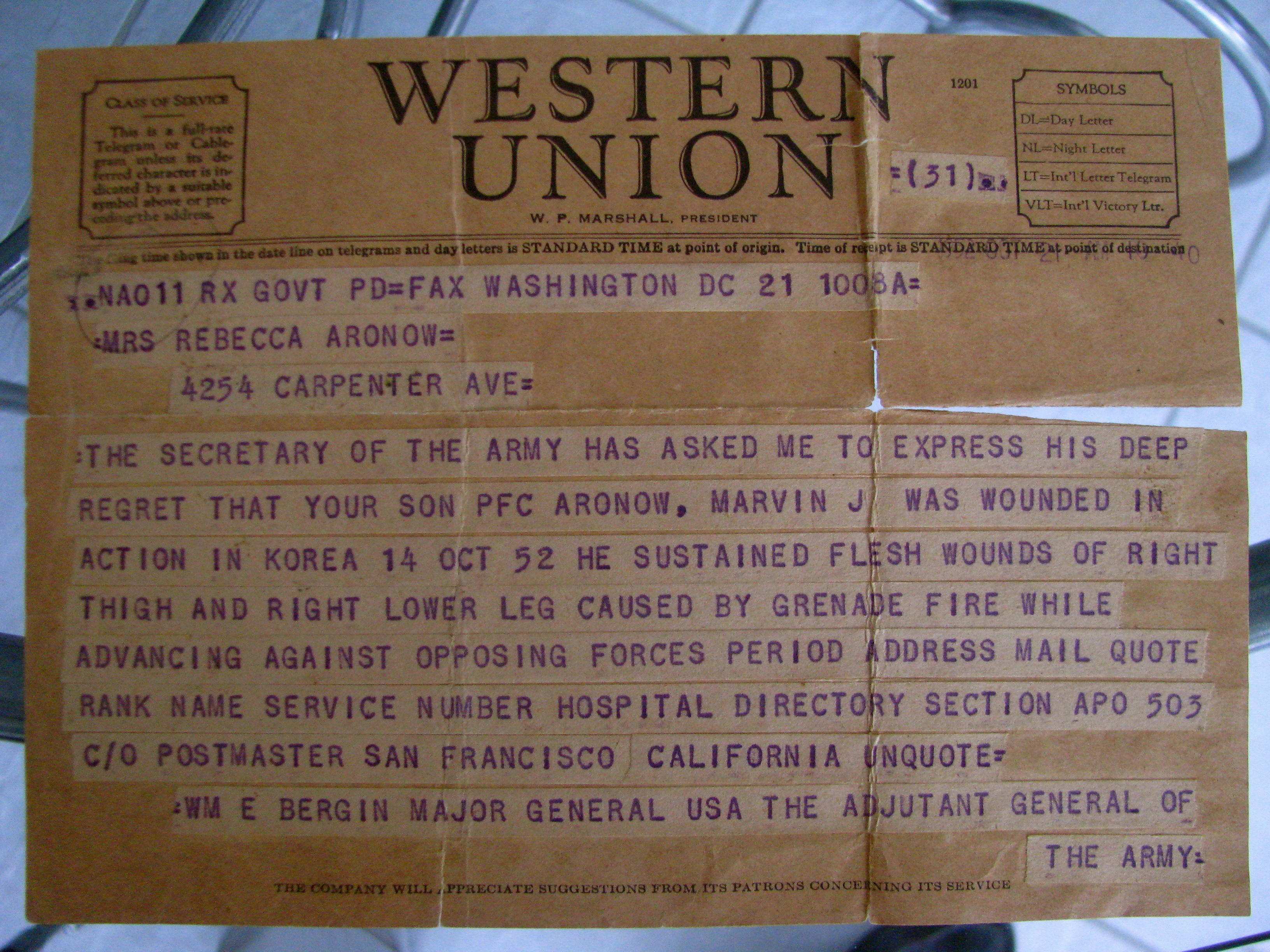 This is the telegram his parents received more than 60 years ago when Aronow was wounded fighting in Korea. Sun photo by Don Moore
