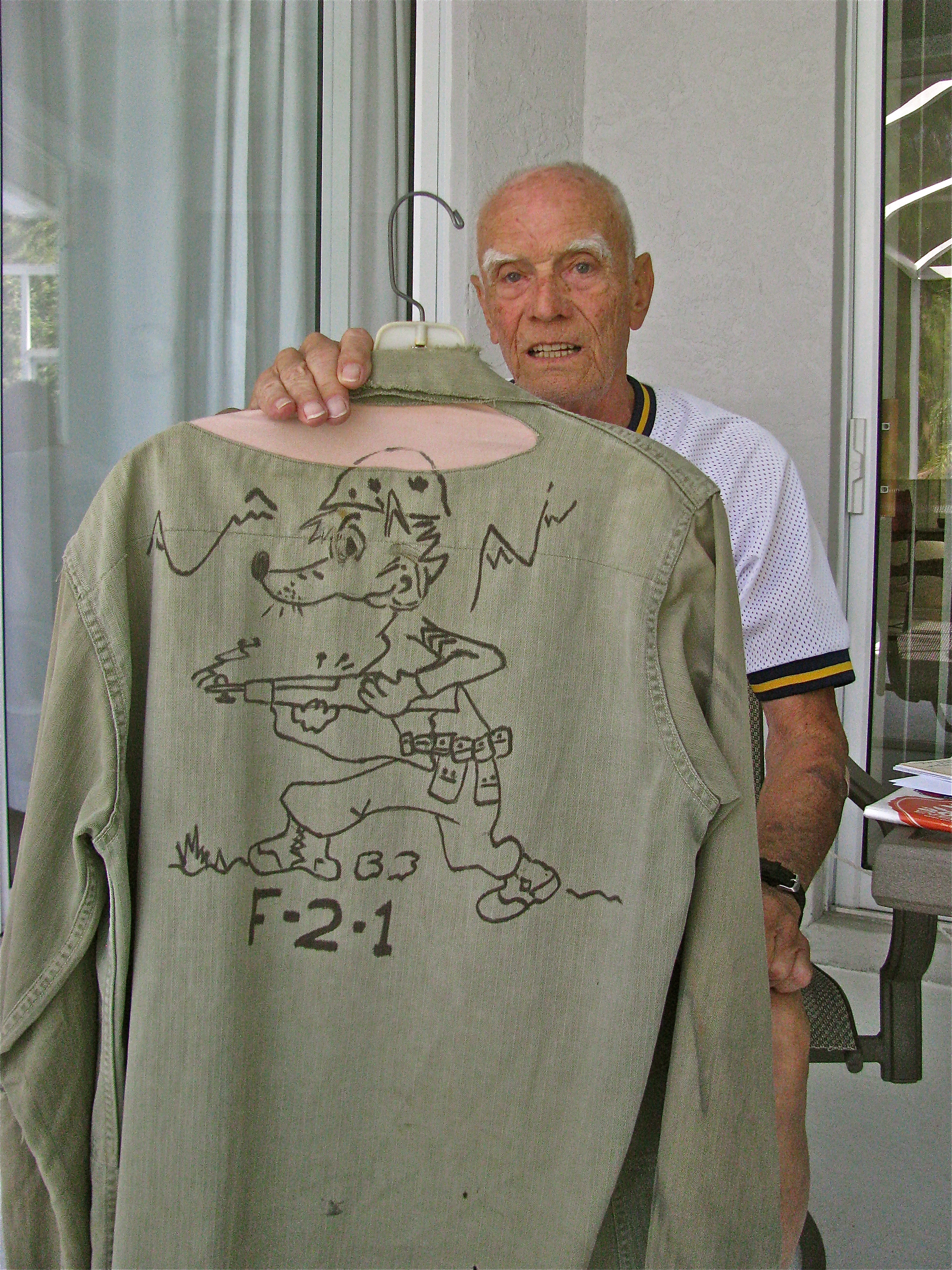 Robb holds a cartoon drawing on the back of his old fatigue shirt, drawn by an unknown artist in his company. It shows a fox in Marine uniform depicting "Fox Company," his unit.