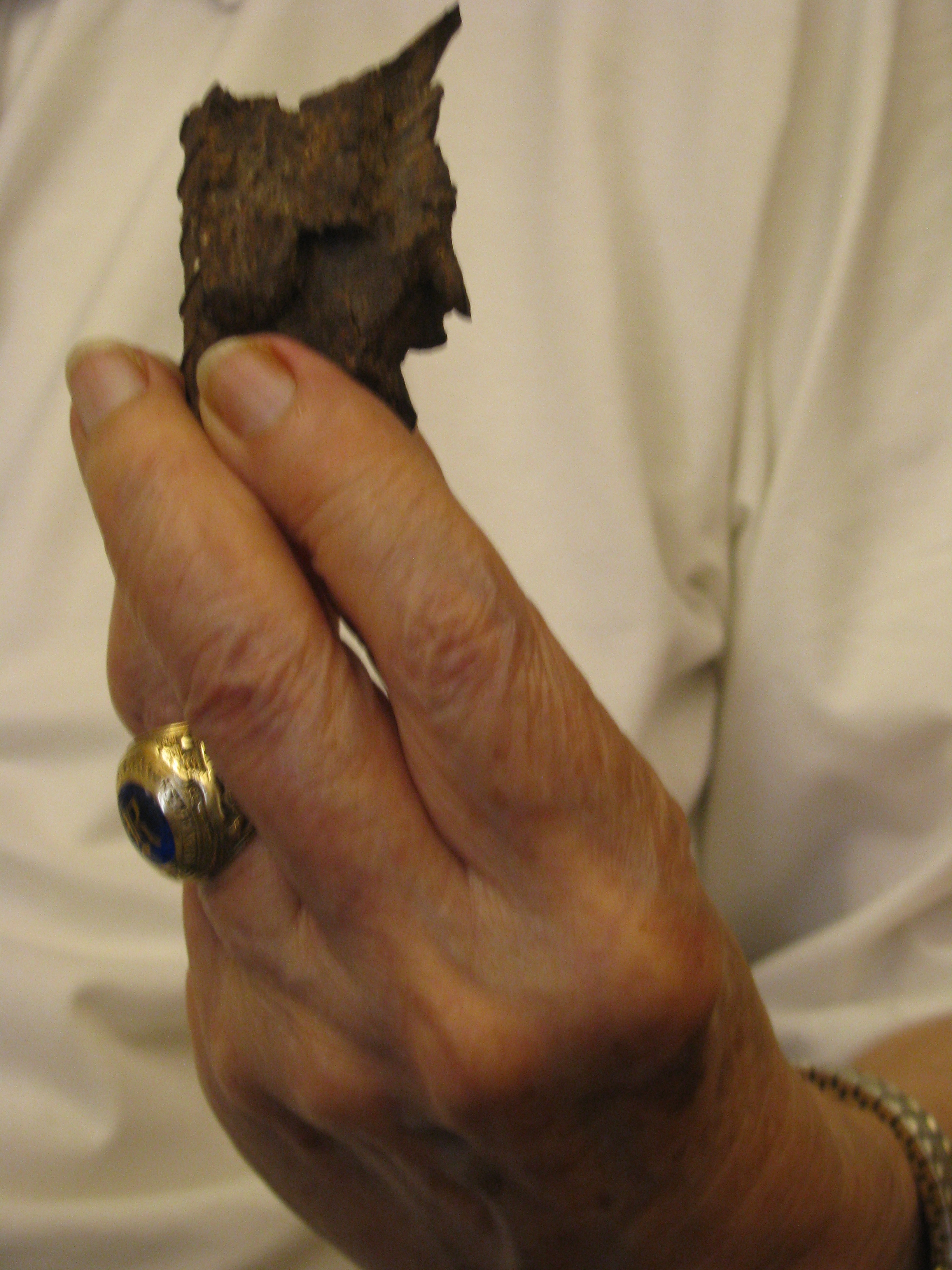 Rohn holding a lethal piece of shrapnel that grazed his arm and landed at his feet while serving aboard the Tennessee during the Battle of Okinawa. The gold ring is the one he received after graduating from Annapolis. Sun photo by Don Moore