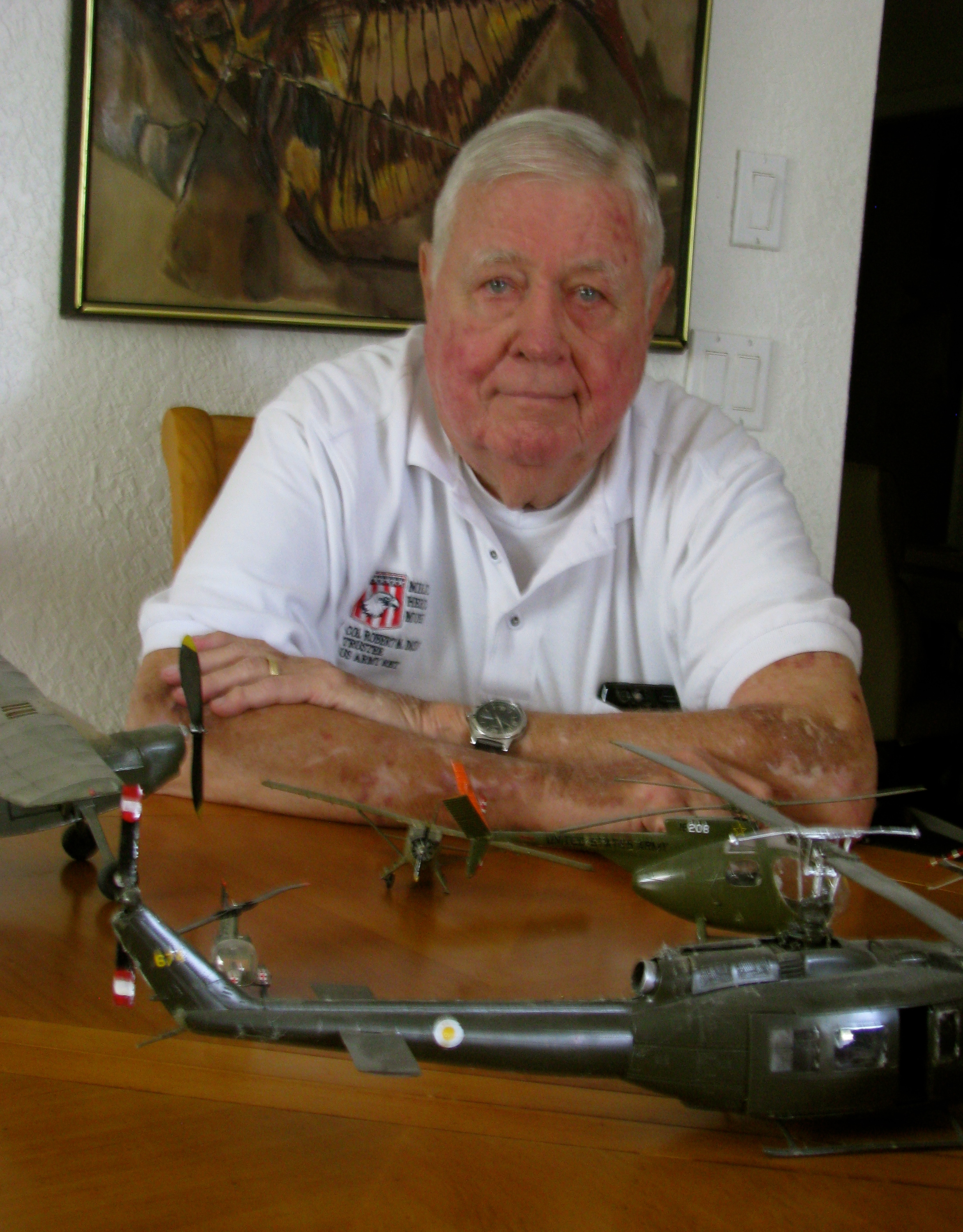 Dickinson sits in front of some of the models of fixed wing planes and helicopters he flew during his decades of service in Army aviation. Sun photo by Don Moore