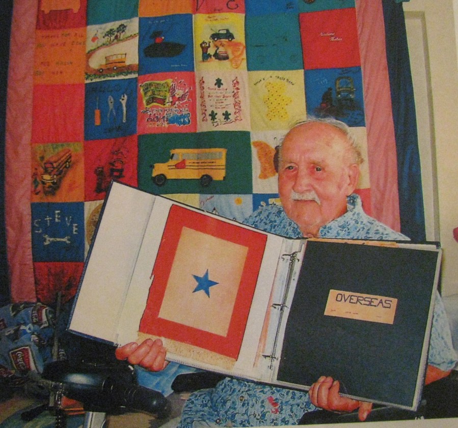 Former Staff Sgt. Steve Kruger holds a scrapbook of his service during World War II his late wife prepared for him. The scrapbook is opened to a “Service Flag” flown in the windows of millions of homes during the war. It signified the Kruger family had a child in the military. The quilt on the wall was a retirement present for working as a mechanic for two decades with the retirement present for working as a mechanic for two decades with the Hillsborough County School Transportation Department. Sun photo by Don Moore