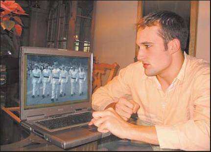 Bryan Coward looks at a photo of himself and other members of his junior year class at West Point. They’re in their summer dress uniforms marching at the head of a parade at the end of basic training. Bryan is second from left in the photo on his computer screen. Sun photo by Don Moore