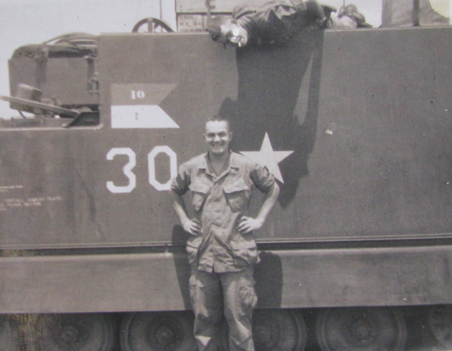 Behind Mac Lellan is an armored personnel carrier he was in charge of during part of the time he spent in the Central Highlands in Vietnam. Photo provided
