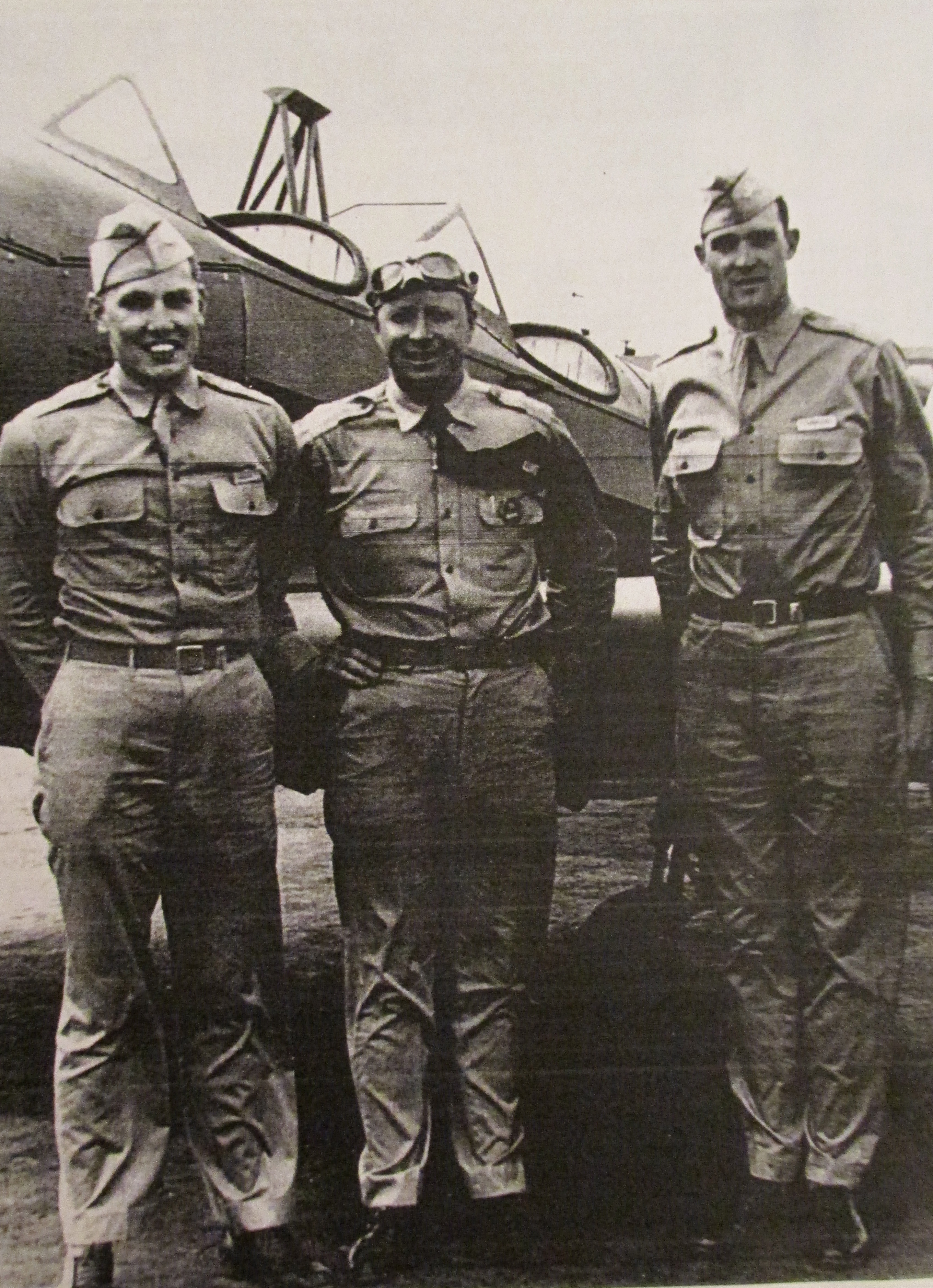 Second Lt. Bill Haase, left, stands in front of a PT-19 biplane with his instructor and another student pilot at an Army airfield near Lubbock, Texas, where he first learned to fly. When this picture was taken he had logged 60 hours of flight time. Photo provided.