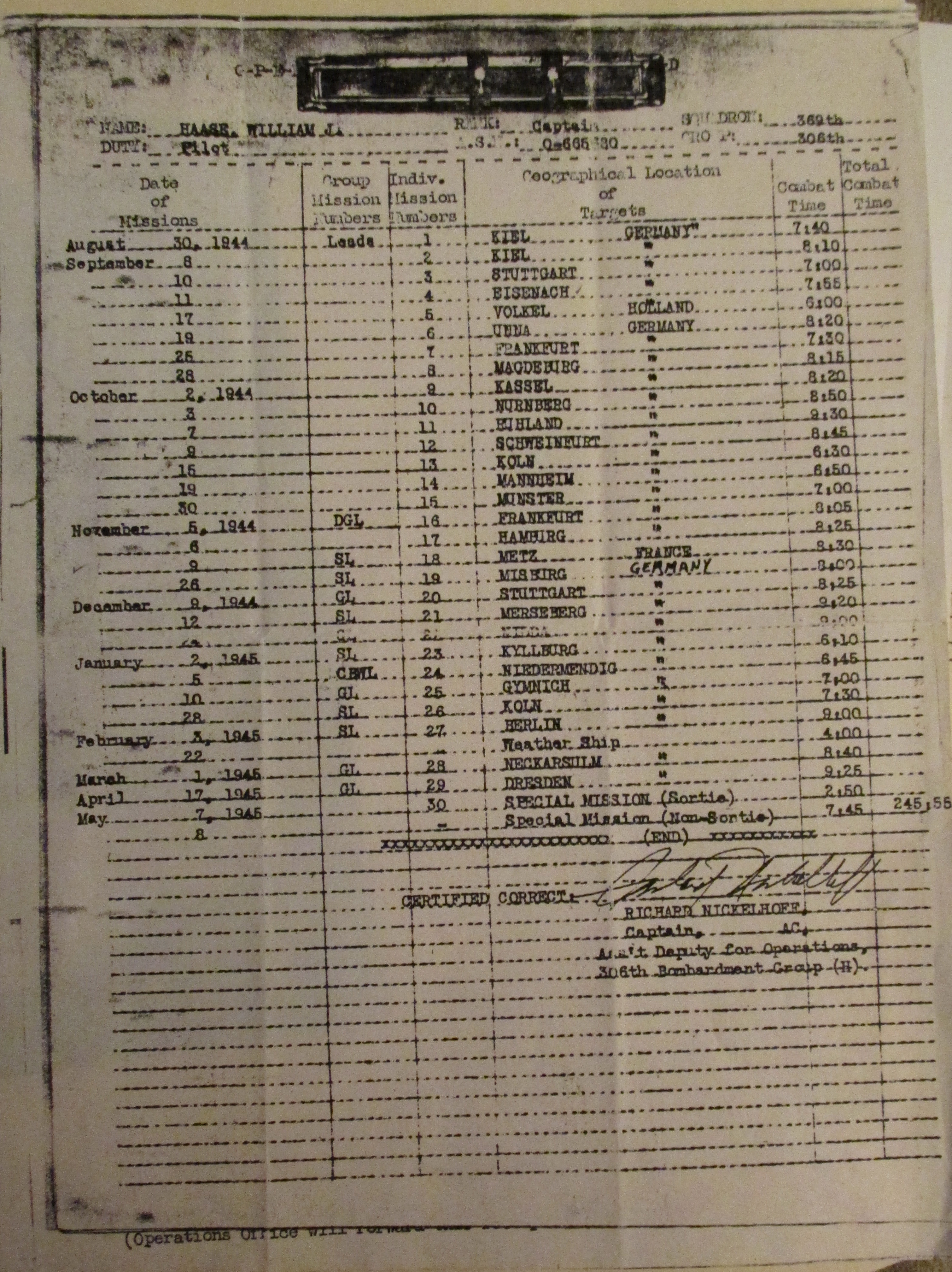 Haase’s Mission Log lists 30 bomb runs his B-17 crew made beginning on Aug. 30, 1944 and running until May 1945 over Germany, Holland and France.